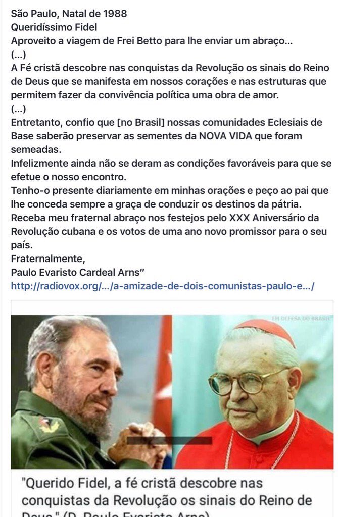 Anexo(48) #Brasil conexión #Vaticano y #comunismo Cardenal de #Brasil PAULO EVARISTO ARNS (inicialmente franciscano, pero estudió en instituciones #Jesuitas ), envió carta a Fidel Castro en 1988 con motivo de los 30 años de la revolución comunista en #Cuba