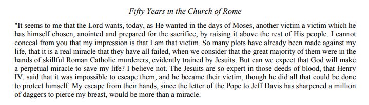 Anexo(53) Charles Chiniquy autor del libro -Fifty Years in the Church of Rome- relata una conversación con ABRAHAM LINCOLN donde este teme por su vida. Fue excomulgado de la iglesia católica cuando se atrevió a denunciar, entre otras, la intenciones de los #jesuitas en América.
