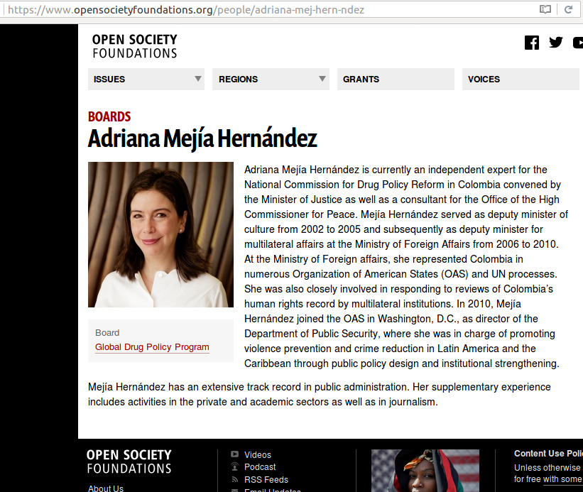 3- Nombró en su equipo de trabajo a una persona de Open Society (Soros) en legalización de drogas, Adriana Mejía.