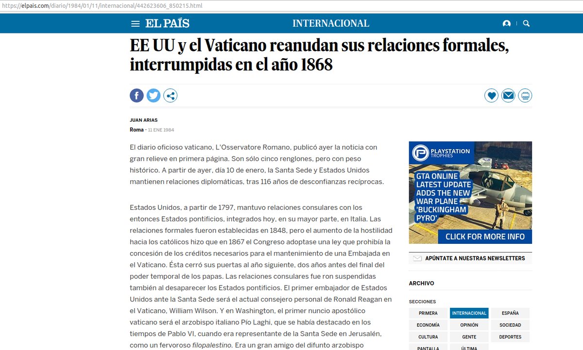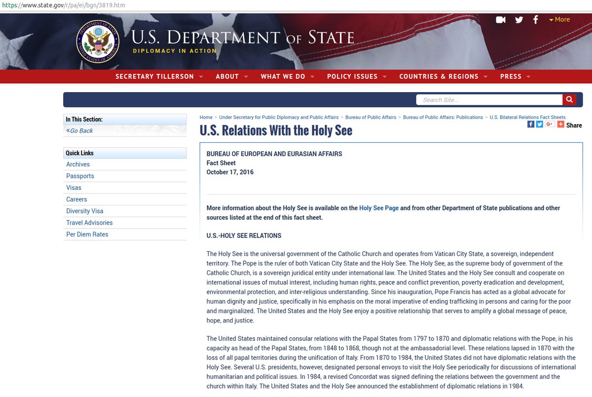 Anexo(54) EEUU rompe relaciones con el #Vaticano a partir de 1867-68, 2 años luego de la muerte de ABRAHAM LINCOLN. Las relaciones solo volvieron a la normalidad en 1984 durante el gobierno de RONALD REAGAN y el Papado de JUAN PABLO II